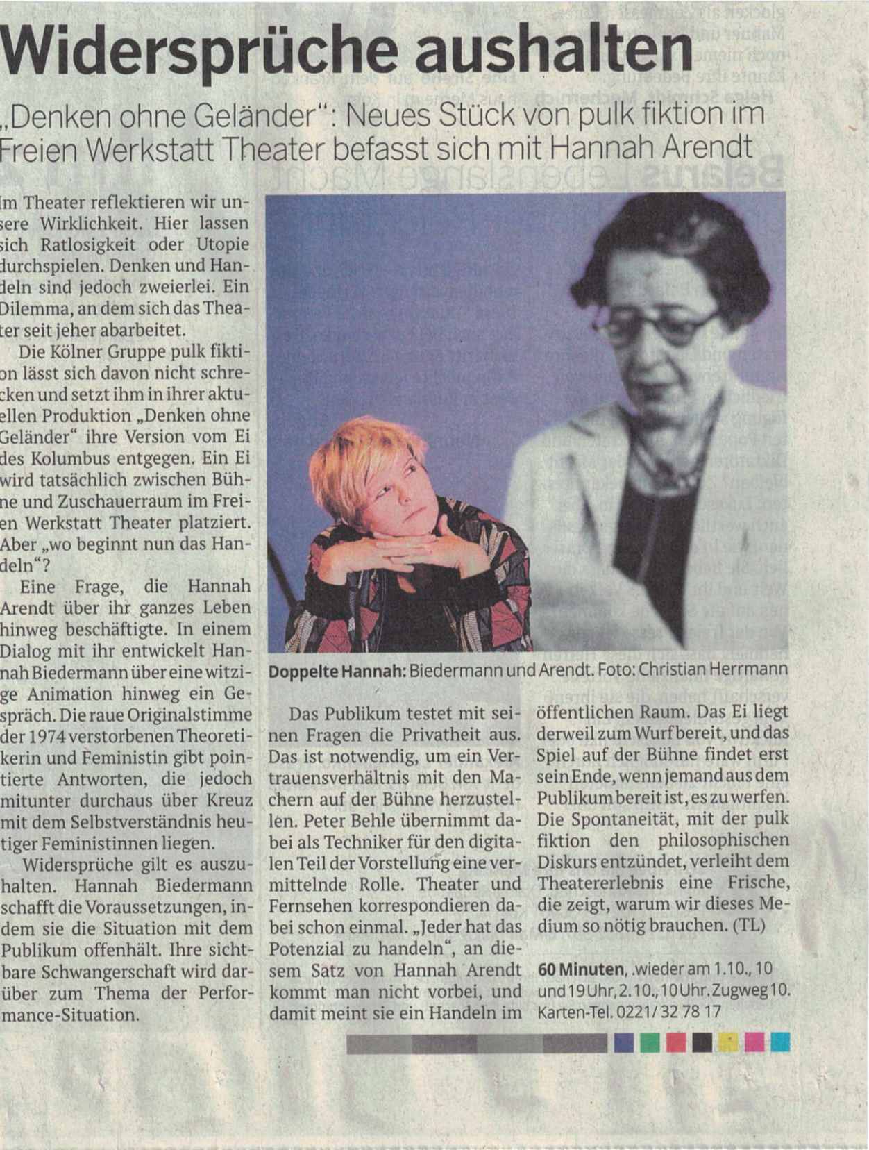 „Biedermann und Behle bringen viel Schwung in die schwer zu begreifenden Denkweisen Arendts. Die Gestaltung ist ebenfalls nicht am Zahn der Zeit vorbei. (…) Ob eine Twitter-Meldung von Arendt, ein sprechender Aschenbecher, eine rauchende und lichtverspielte Bühne oder eine hochmoderne Schreibmaschine – der Pulk hat sich viele interaktive und auflockernde Methoden einfallen lassen.“