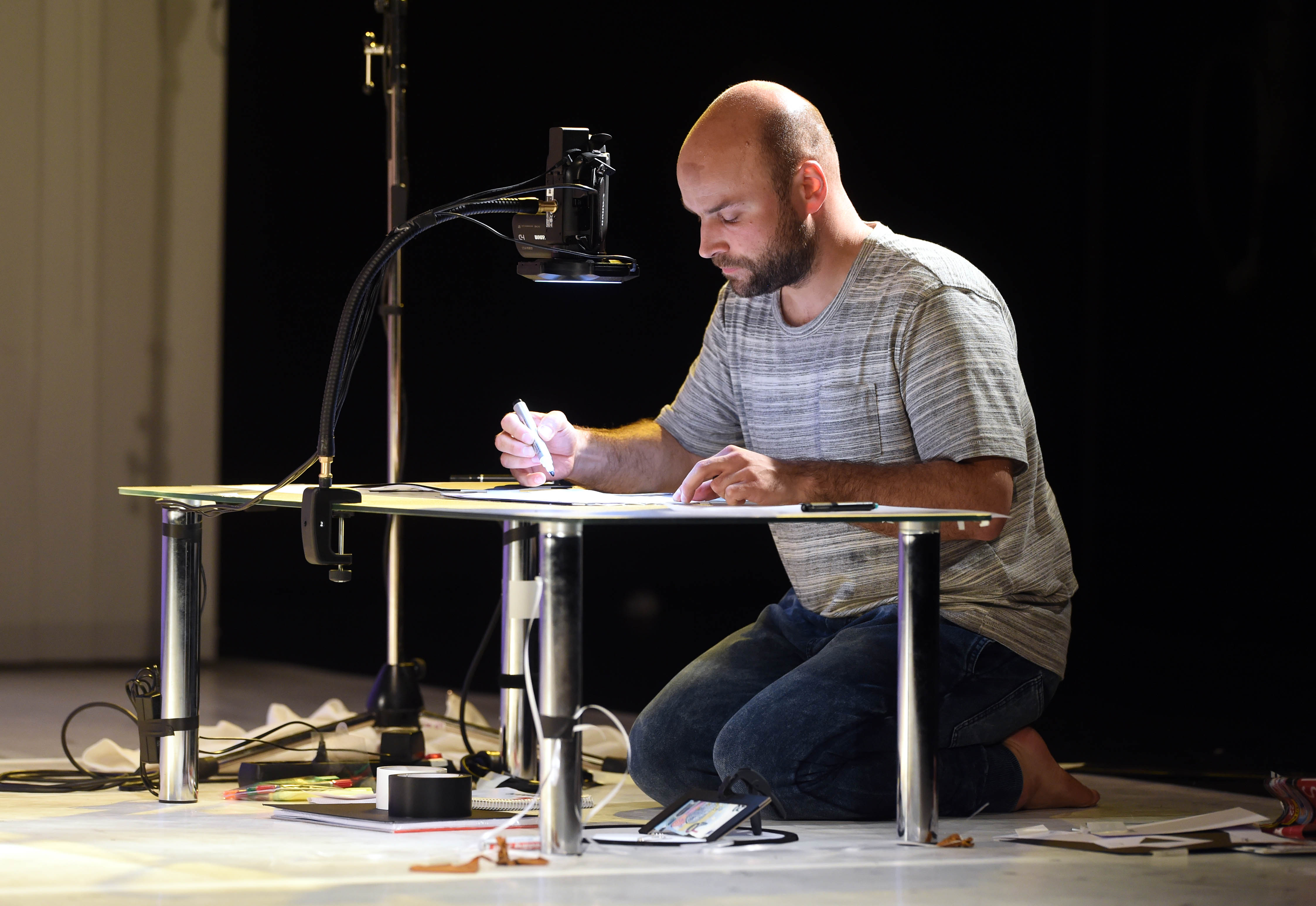 Ob es sich um Punkte am Boden handelt, bei deren Berührung ein Ton ensteht, oder aber um eine Wand voll Briefkästen, die schnell mal vor der Kamera gezeichnet wird. Es gibt kein starres Bühnenbild. Alles ist dauerhaft in Bewegung, wird entwickelt, wird verändert, wird gelöscht.