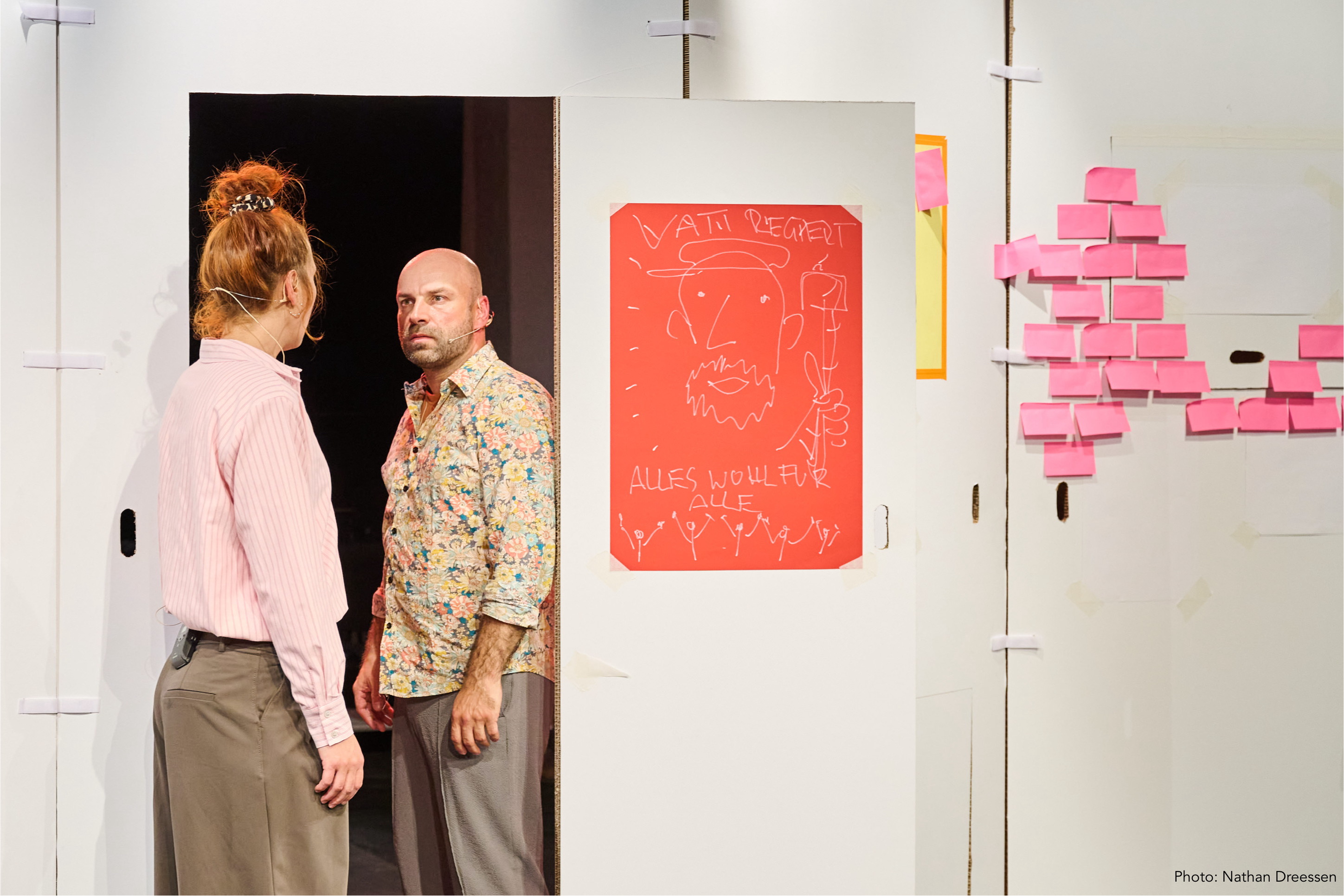 Zwei Performer*innen, die jeweils ost- bzw. westdeutsche Biografien in sich tragen, begegnen sich auf der Bühne. Was bedeutet es, als Kind eines bestimmten politischen Systems aufzuwachsen? Welche Narrative, Denkweisen, aber auch Sehnsüchte, Brüche und Missverständnisse tragen wir weiter?