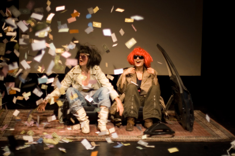 „Geldscheine flattern durch die Luft als Zeichen für die große Freiheit. Zwei junge Frauen haben alles hinter sich gelassen: Verpflichtungen und Rücksicht inklusive. Das Geld stammt à la Bonnie und Clyde aus aus einem Banküberfall.Aber wohin führt ihre Reise durch die Nacht die beiden? Jetzt, wo sie sich alles kaufen können, den Strand und das Meer, scheint das Limit nur noch der Himmel zu sein. Das Marabu Theater hat seine Bühne wieder einmal zum “Experimentierplatz” erklärt, und unter der Regie von Eva von Schweinitz, Studentin des Fachbereichs Drehbuch an der internationalen Filmschule in Köln, ist mit “Ein Stück Autokino” eine rasante und explosive Inszenierung entstanden. Einmal so cool sein wie Helden im Film. Einsteigen, losfahren, und hinein ins wilde Irgendwo. Also alles nur vom Kino geklaut? Keinesfalls, denn die Inszenierung unterwandert geschickt die Genregrenzen zwischen Film und Theater. Wenn Hannah Biedermann als eine der jungen Wilden die Bank überfällt, sieht das auf der Leinwand brutal echt aus. Aber die Kamera filmt natürlich nur einen Ausschnitt und das vermeintliche Opfer, das scheinbar rücksichtslos zusammengeschlagen wird, ist auf der Bühne nicht mehr als eine hohle Perücke. Mit Lippenstift, Schminke, Sonnenbrillen, Perücken und einem Autowrack proben Biedermann und Manuela Neudegger den freien Fall aus der Gesellschaft. Sich selbst verfolgen sie als das komische Kripo-Duo Schmidt und Schmitz, das als schräge Kreuzung aus Film Noir und Tatort den beiden Aussteigerinnen ständig mit Tatütata und Megaphon auf den Versen ist. Tatsächlich eingeholt aber werden die beiden jungen Wilden nur von ihren Alter Egos, die sie als Anhalterinnen mitnehmen. In einer großartigen Szene, die aus einer Filmsequemz von Biedermann und Neudegger auf der Rückbank eines Autos und dem Gangsterduo Biedermann und Neudegger auf der Bühne zusammengesetzt ist, treffen gesetzlose Coolness und Banalität des Alltags ungebremst aufeinander. “Ein Stück Autokino” ist mehr als eine Versuchsanordnung für den cineastischen Egotrip, sondern eine traumhafte Achterbahnfahrt.“