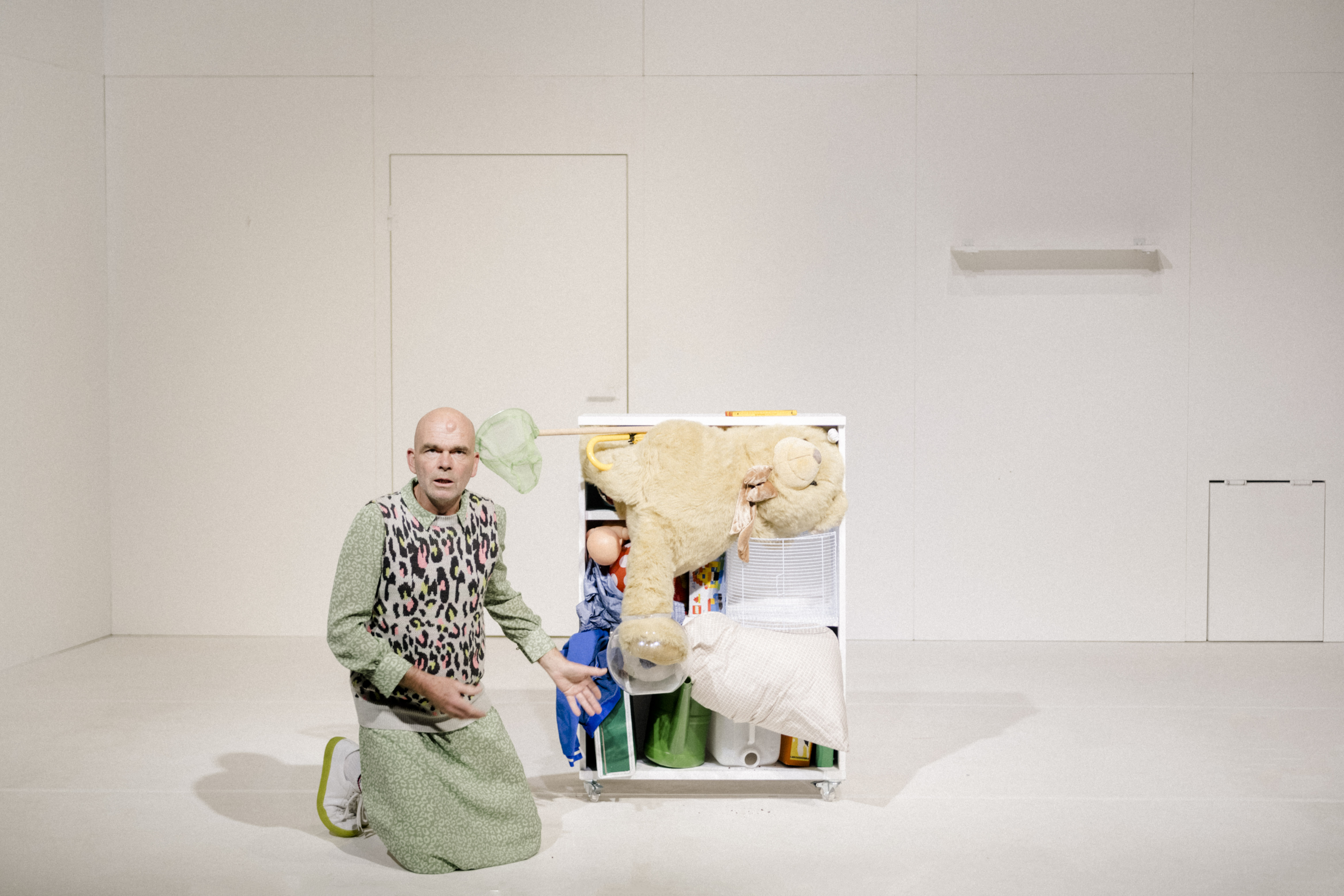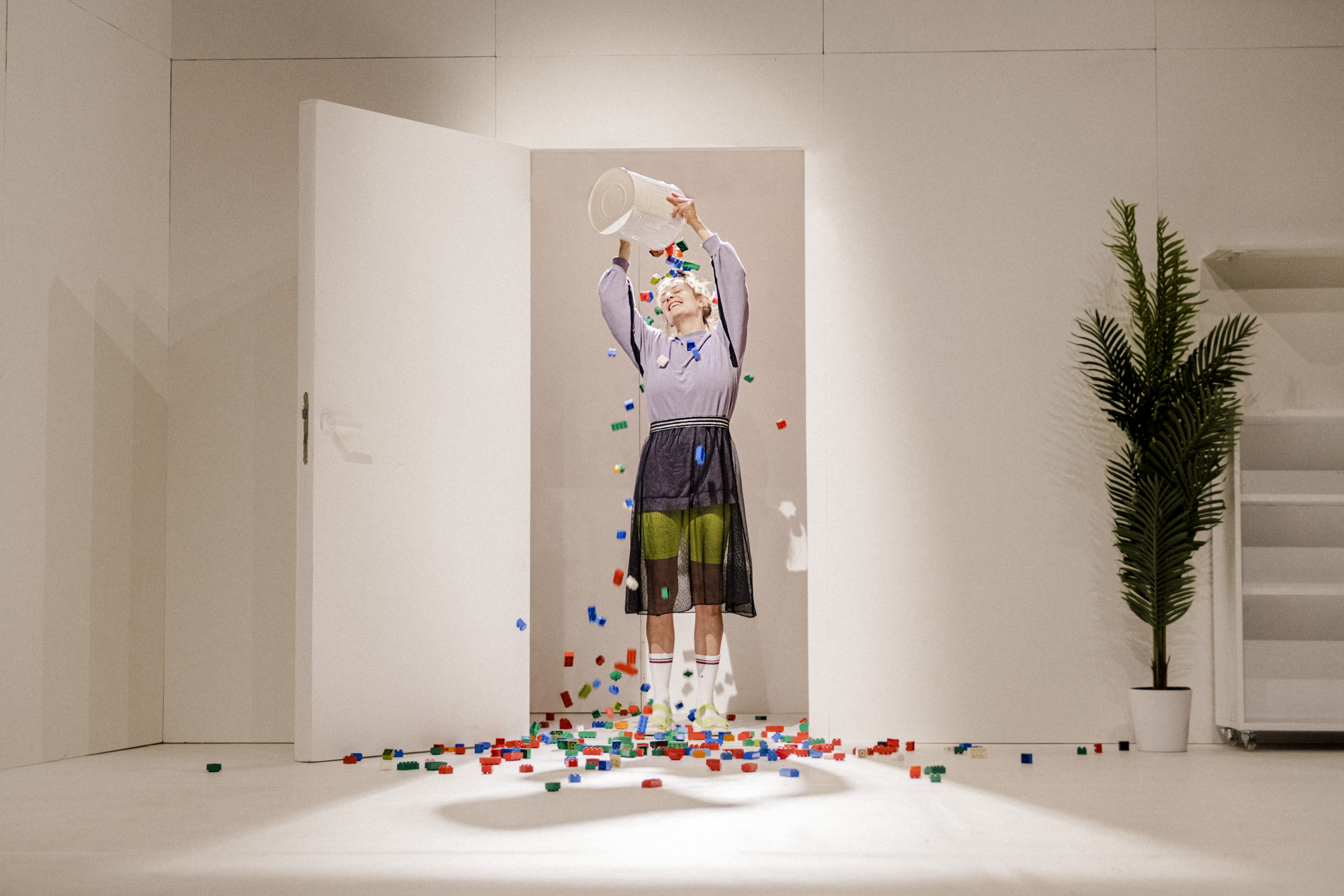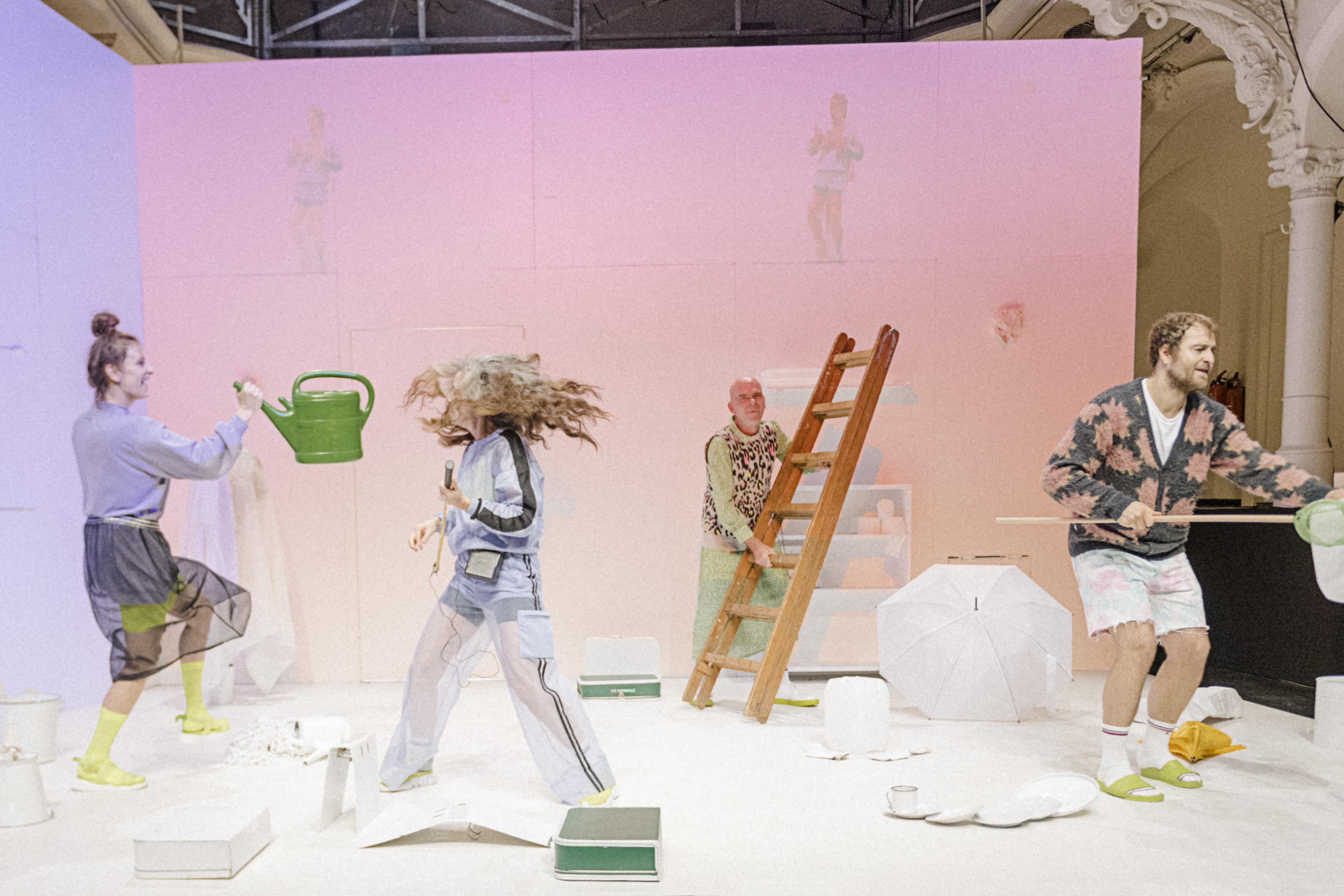 Um in einen weißen Raum Ordnung zu bringen, muss erstmal etwas hinein. Vier Performer:innen und ein Musiker bringen Dinge mit: die sie brauchen? Die sie lieben? Die sie einfach nicht loswerden? Die sie, glauben, haben zu müssen? Sie richten sich ein, sie verschieben, bauen um, füllen auf. Sie verlieren den Überblick und lieben das Chaos. Die Dinge gehören ihnen und sie gehören den Dingen. Ebenso die großen und kleinen Geschichten, die sich alle hinter diesen Dingen verstecken und darauf warten, erzählt zu werden. Womit anfangen?