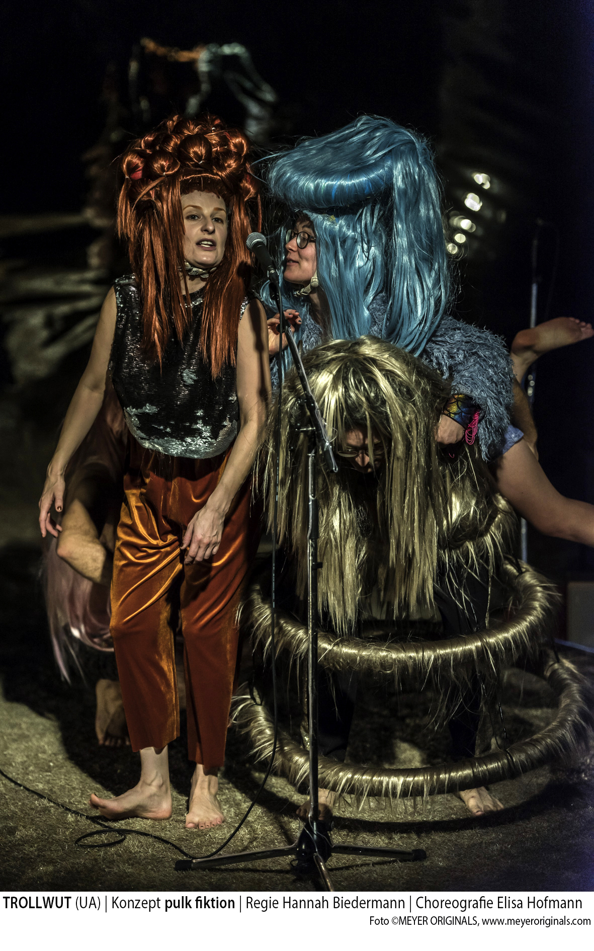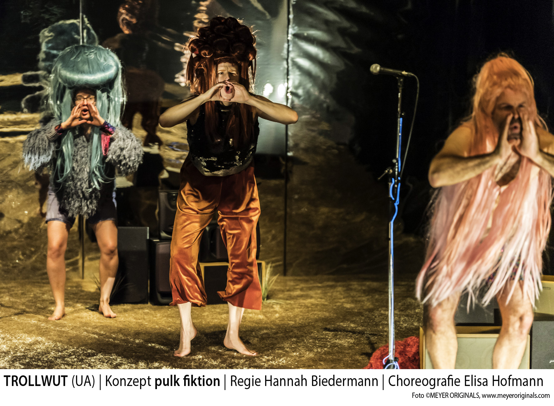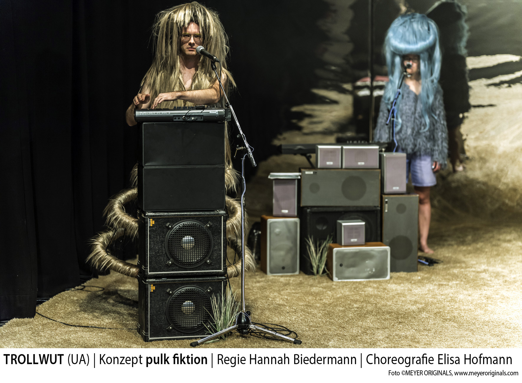 Da sind wirklich Trolle auf der Bühne. Ria Papadopoulou stattet die vier Spieler und Musiker mit riesigen surrealen Perücken aus, hingegen finden sich in der Kleidung, die vornehmlich aus „haarigen“ Elementen besteht, eher Show-Elemente. Auch ihr Bühnenbild ist eine Mischung aus Showbühne und digitalem Assoziationsraum. Vor einer Hintergrundwand aus Spiegelfolie sind im Raum vier Mikrofone auf Ständern verteilt, denen jeweils vier Stapel an verschiedenen Lautsprecherboxen zugeordnet sind. Im Dunkel leuchten die Kabel der Ständer auf dem beigefarbenen Teppichboden, den man nur barfuß betreten darf. Musikalisch ist das Ensemble hervorragend aufgestellt. Nicolas Schneider und Connie Frieder treiben das Ensemble mit bekannten Melodien voran, die manchmal neue Texte bekommen. Das ist einfach gut gemacht.