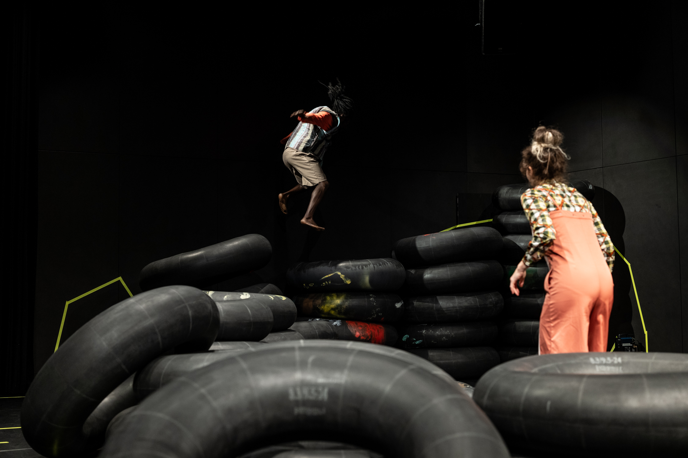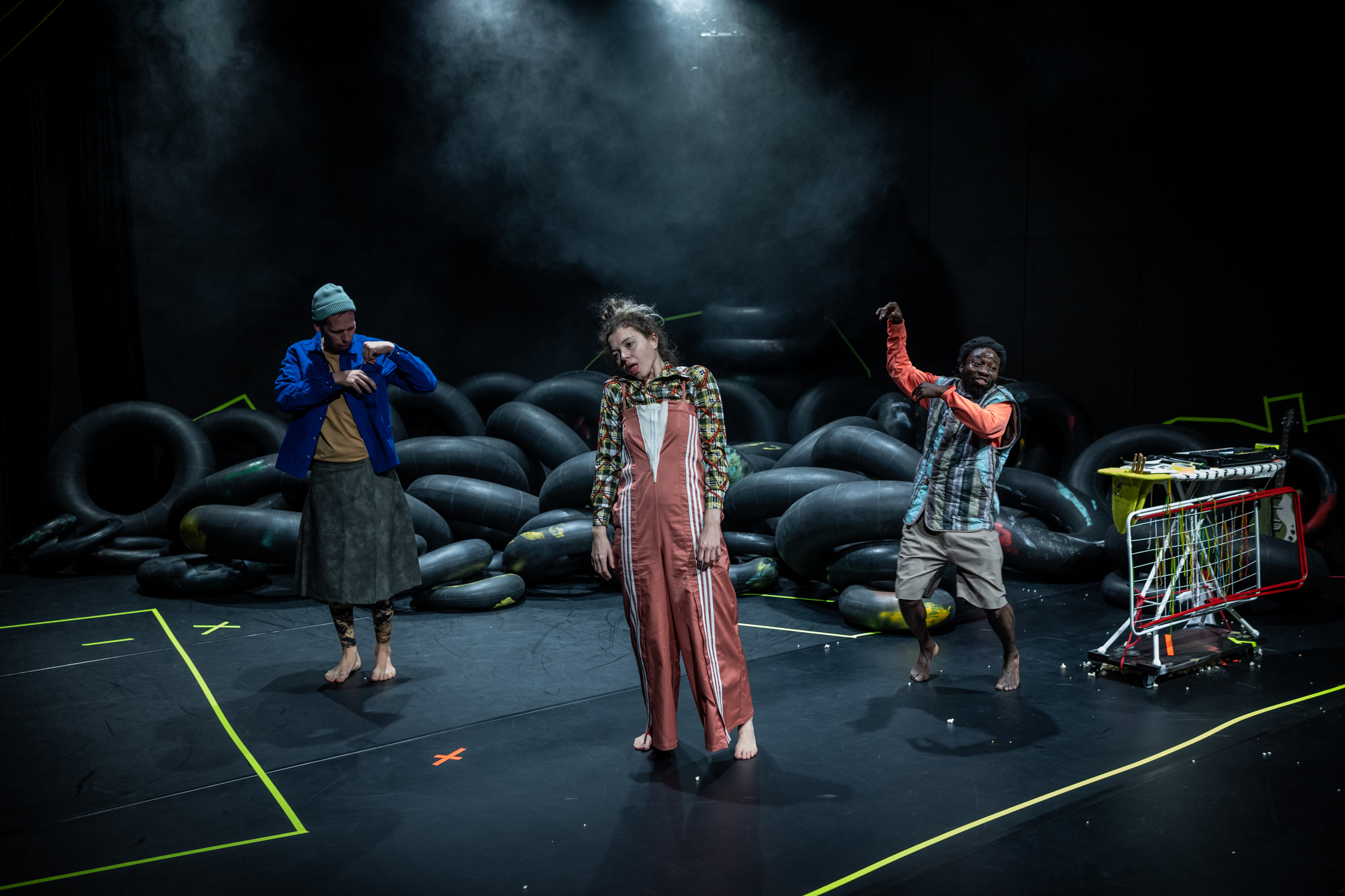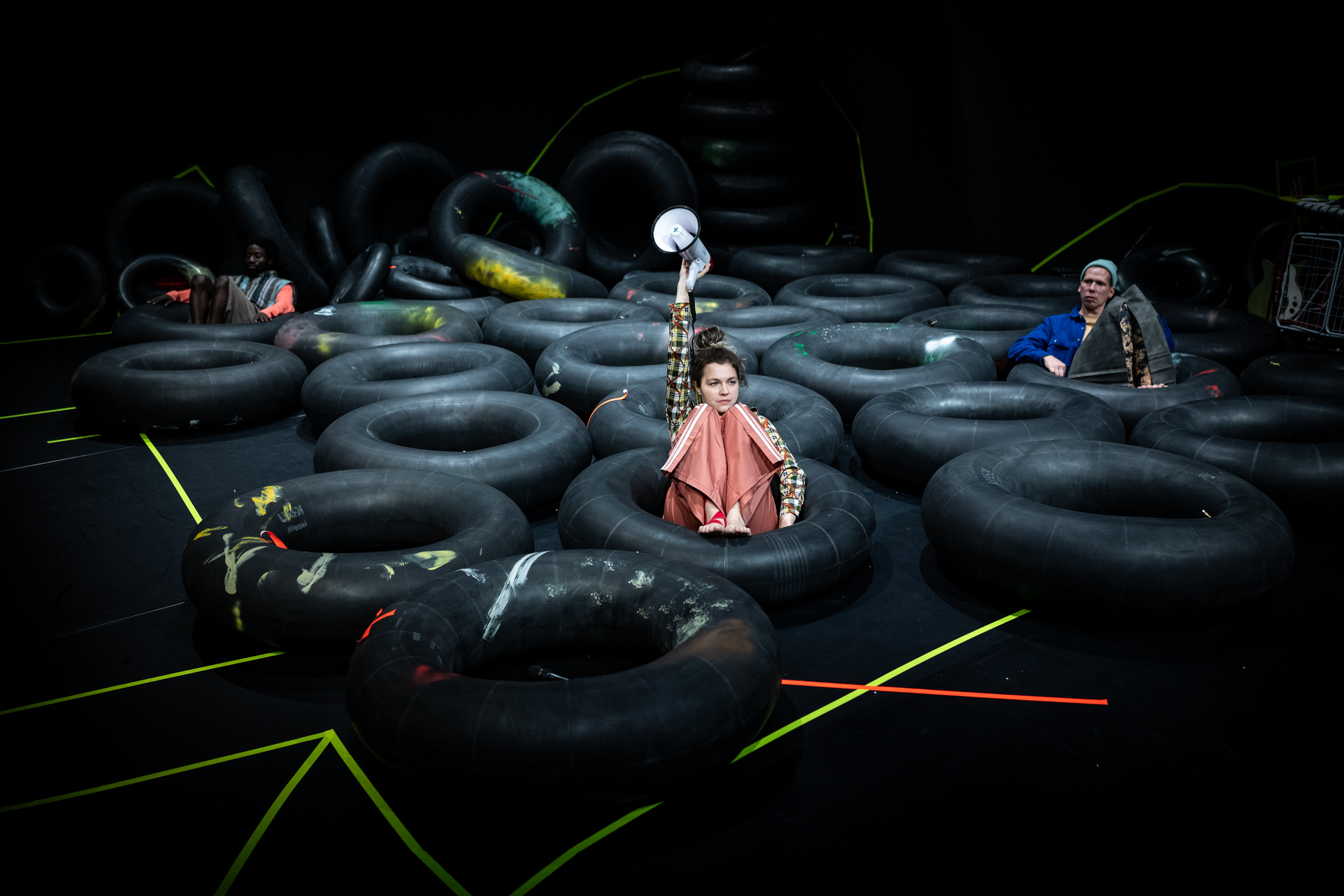 Hinter der Schule gibt es ein großes Erdloch, in dem die Kinder begeistert toben, nur ist das den Erwachsenen zu riskant. Aber wie bekommt man nun die Grube auf die Bühne, wenn man aus dem Bilderbuch eine Theaterproduktion macht? Für die Kinder- und Jugendtheatergruppe pulk fiktion im Freien Werkstatt Theater ist das kein Problem. Wieder einmal überrascht die Truppe aus Köln und Düsseldorf mit einer genialen Idee und überschwemmt den Bühnenraum mit großen und kleinen Gummireifen. So entsteht eine wüste Landschaft, in der sich Unvorhersehbares inszenieren lässt. Und genau das gelingt dem Schauspieler-Trio (Mohammed Marouf Alhassan, Simon Brinkmann und Julia Hoffstaedter), indem es die Schwelle zwischen Spiel und Theater immer wieder zu verwischen mag.