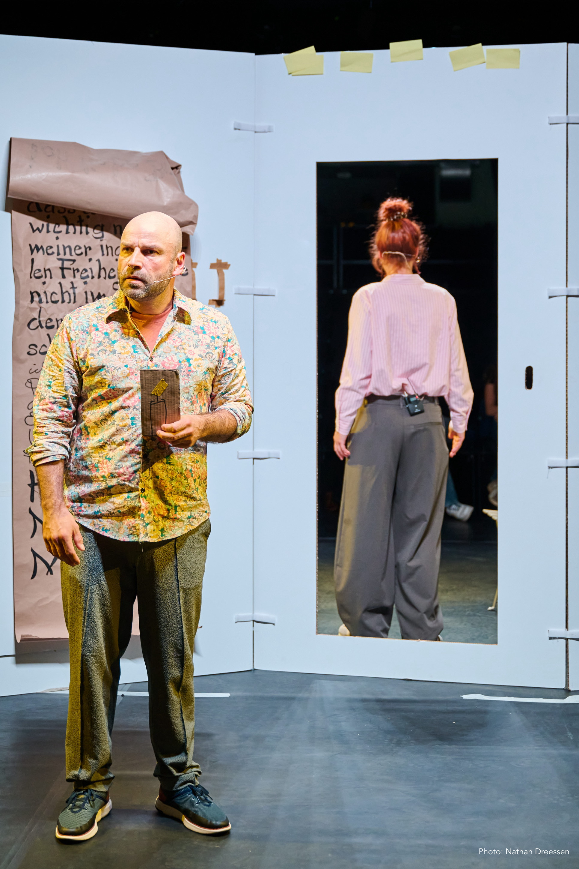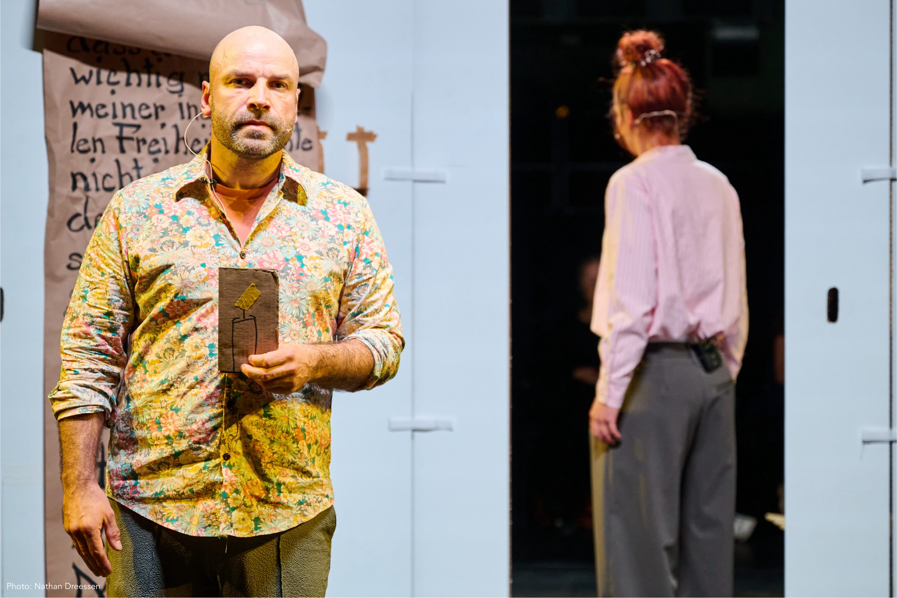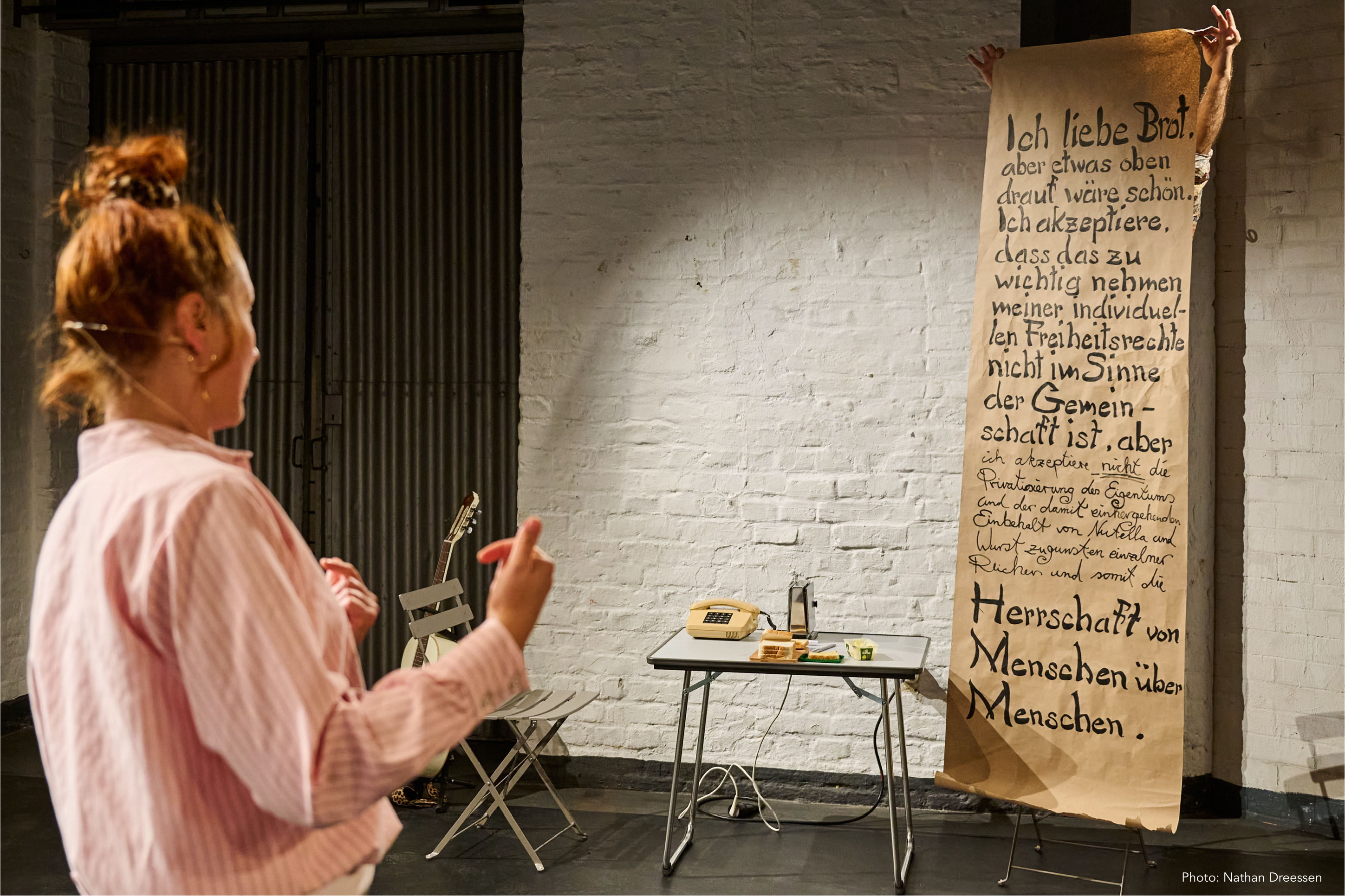 Zwei Performer*innen, die jeweils ost- bzw. westdeutsche Biografien in sich tragen, begegnen sich auf der Bühne. Was bedeutet es, als Kind eines bestimmten politischen Systems aufzuwachsen? Welche Narrative, Denkweisen, aber auch Sehnsüchte, Brüche und Missverständnisse tragen wir weiter?