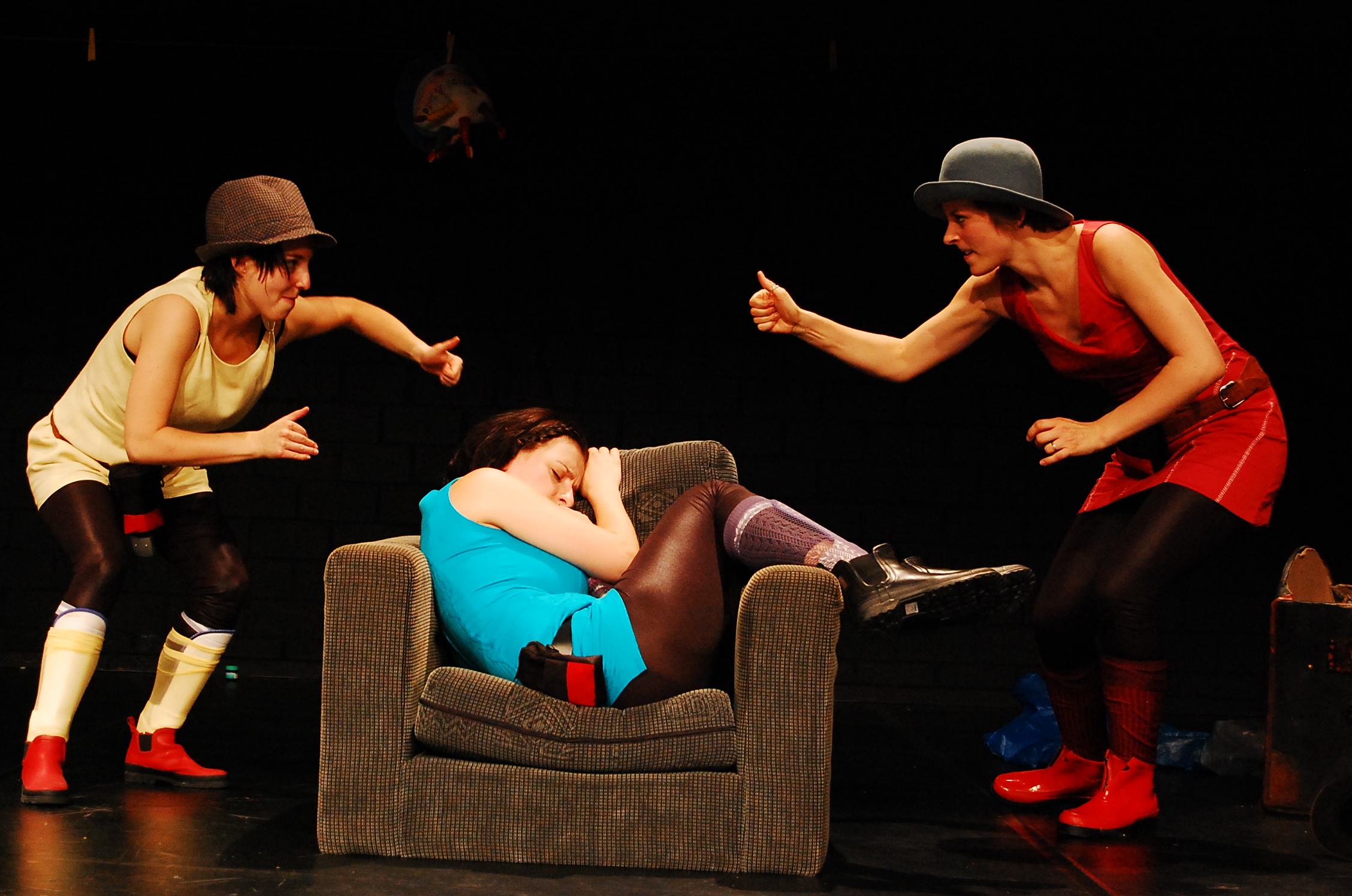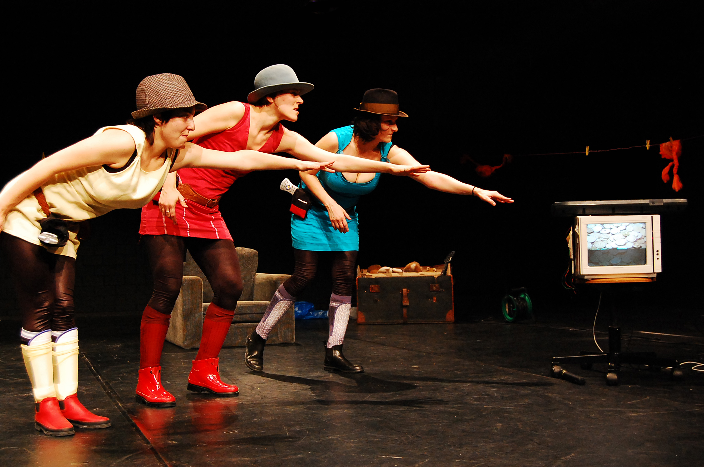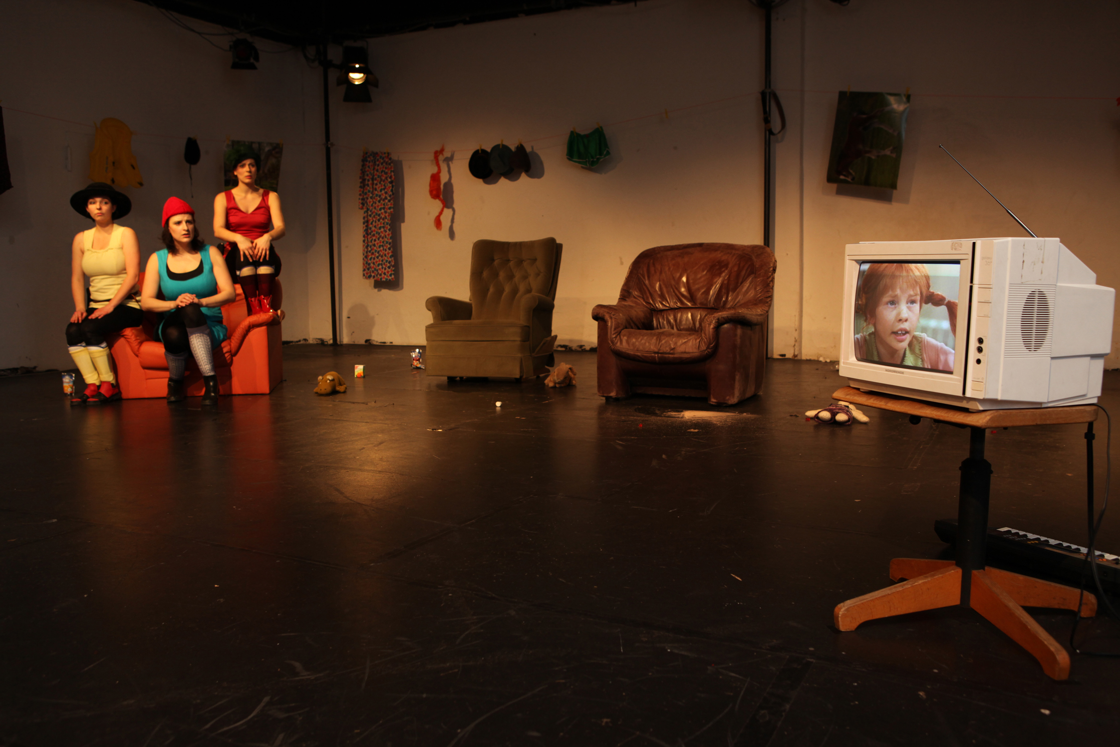Auf der Bühne, ausgestattet mit drei Sesseln und einer mit ausgewählten Pippi-Accessoires behängten Wäscheleine, ist alles erlaubt. Auch Weinen. Hier darf man, Heldentum hin oder her, auch zeigen, wenn man sich schutzlos fühlt. In dem kollagenartig angelegten Regiekonzept spielen die Akteure auf verschiedene Figurenebenen, schlüpfen in Fremdfiguren des Pippi-Kosmos oder treten als sie selbst in Aktion, auch in direkter Konfrontation mit dem Publikum.