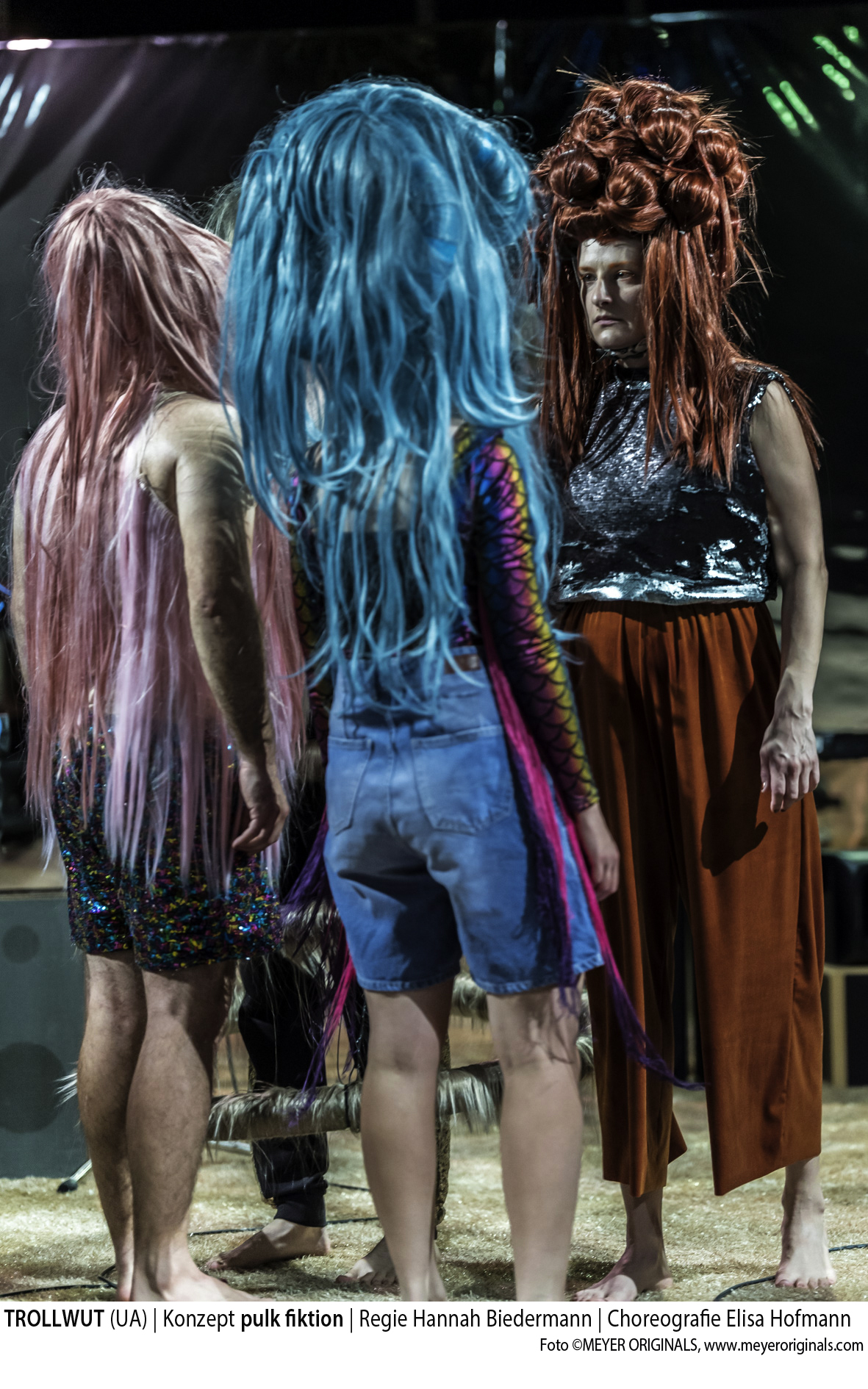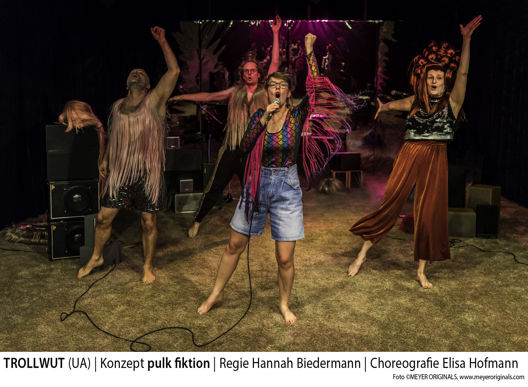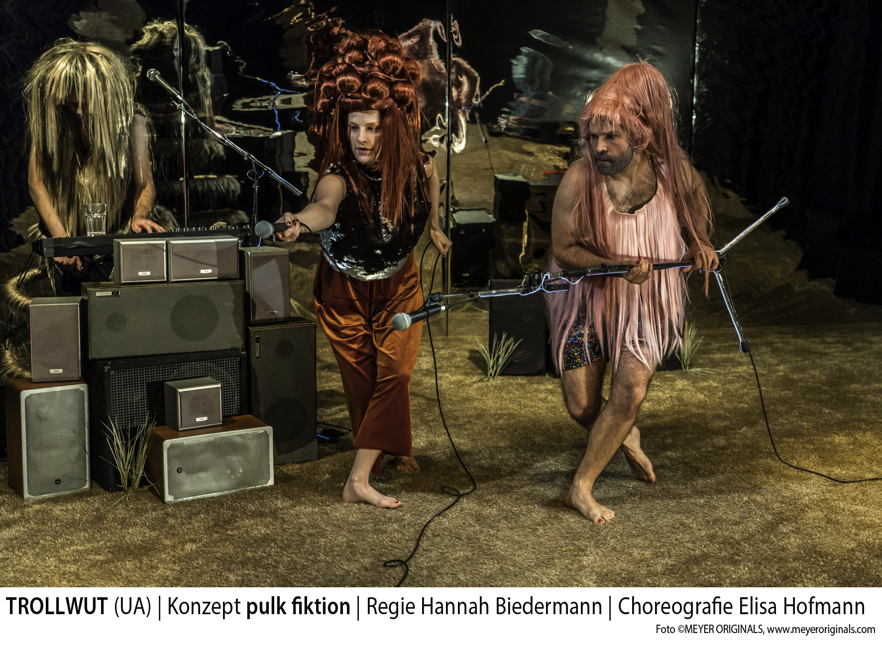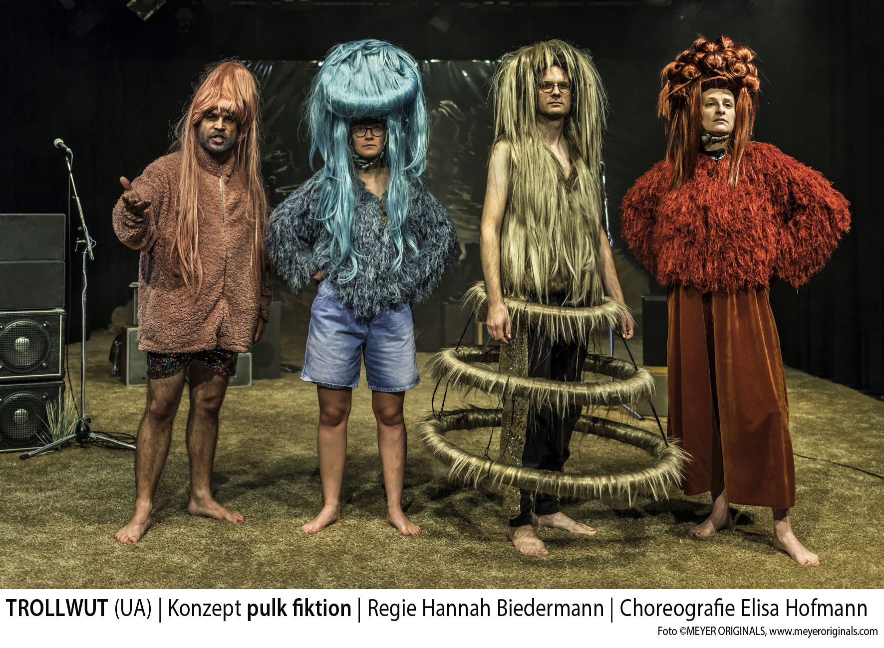 Da sind wirklich Trolle auf der Bühne. Ria Papadopoulou stattet die vier Spieler und Musiker mit riesigen surrealen Perücken aus, hingegen finden sich in der Kleidung, die vornehmlich aus „haarigen“ Elementen besteht, eher Show-Elemente. Auch ihr Bühnenbild ist eine Mischung aus Showbühne und digitalem Assoziationsraum. Vor einer Hintergrundwand aus Spiegelfolie sind im Raum vier Mikrofone auf Ständern verteilt, denen jeweils vier Stapel an verschiedenen Lautsprecherboxen zugeordnet sind. Im Dunkel leuchten die Kabel der Ständer auf dem beigefarbenen Teppichboden, den man nur barfuß betreten darf. Musikalisch ist das Ensemble hervorragend aufgestellt. Nicolas Schneider und Connie Frieder treiben das Ensemble mit bekannten Melodien voran, die manchmal neue Texte bekommen. Das ist einfach gut gemacht.